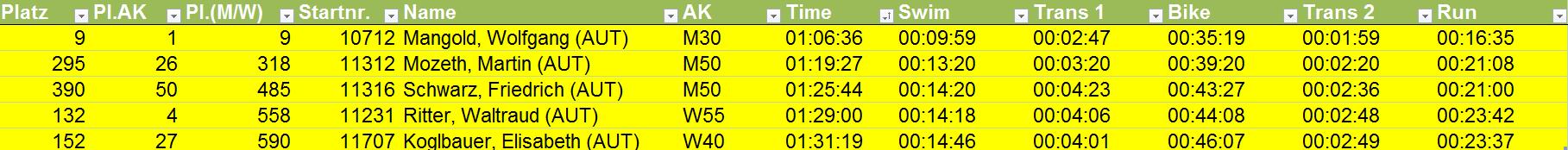 Allen voran konnte unser Aushängeschild, Wolfgang Mangold, seine Klasse unter Beweis stellen. Nachdem er beim Schwimmsplit schon als 3. aus dem Wasser stieg, verlor er auf der anspruchsvollen und durch den Regen sehr schwierig zu fahrenden Radstrecke ein wenig den Anschluss zur Spitze. Bei seiner Paradedisziplin, dem Lauf, konnte er jedoch nochmals zulegen und kämpfte sich mit einer Endzeit von 1:06:36 auf den ausgezeichneten 9. Gesamtrang nach vorne.